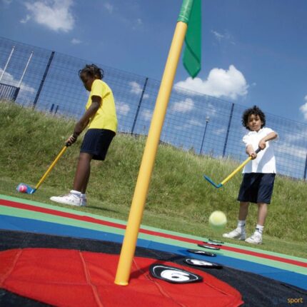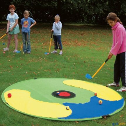Uma face inclui 6 setores em 6 cores e 2 círculos centrais destacáveis. A outra face simula um 'green' de golfe com bunkers, água e buraco central destacável. Com alças de nylon para pendurar, pode ser utilizado na horizontal, elevado ou na vertical. A sua superfície de velcro permite a aderência de diferentes objetos. Alvo fabricado a 100% em poliéster. Inclui saco para armazenamento e transporte. Idade recomendada: +3 anos, utilizar sob supervisão de um adulto