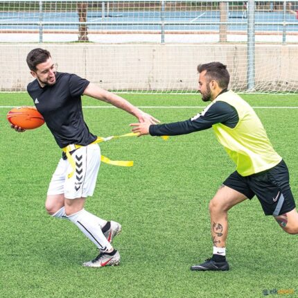 Nova cintura mais resistente. Todo o perímetro exterior em velcro para poder colocar a fita em qualquer parte da cintura. Fitas mais largas de material mais resistente. Ideal para a iniciação ao rugby com maior segurança. O jogador é considerado placado quando se lhe retira uma das fitas que leva penduradas na cintura. É uma versão sem contacto físico e mais segura, sendo por isso muito popular entre jovens.