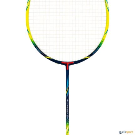 Raquete de badminton em alumínio com cabo em carbono, construída numa só peça. Desenhada com dupla proteção para as cordas: armação com canal que permite que o encordoamento fique protegido do contacto com o solo, e peça de plástico na parte superior para proteger também essa zona da raquete.