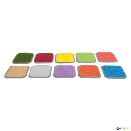 Conjunto de sensações plantares ORIGINAL: Inclui 10 pratos de plástico com base antiderrapante (saliências finas, saliências espessas, linha fina, linha grossa, furos, linhas curvas, carpete, esparto, espuma e relva artificial). Também estão incluídas 2 bases antiderrapantes vazias que podem ser preenchidas com outros tipos de materiais de acordo com as preferências do educador. Por exemplo, água fria, água quente, areia da praia, pedras pequenas, terra, etc. Dimensões: 30 x 30 cm.