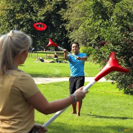 Jogo de lançamento e receção que combina Lacrosse e Ultimate Frisbee. YOU.FO é um jogo inovador baseado em lançar um disco em forma de anel aerodinâmico com sticks. Usando um stick especial, os jogadores devem lançar e pegar o disco enquanto se move para a sua zona área. Quando um jogador recebe o disco, não pode correr com ele, mas pode girar e o lançar de novo. Se o disco cair ao chão, o primeiro jogador ao colocar seu bastão sobre ele ganha a posse. Quando um jogador pega no disco na sua zona de pontuação, você ganha um ponto. Sticks e interior dos anéis fabricados em plástico ABS muito resistente. Para jogar, são necessários 2 sticks (1 para cada jogador) e um disco. Tamanho do stick: 85 cm de comprimento. Tamanho do disco: 23 cm ø.