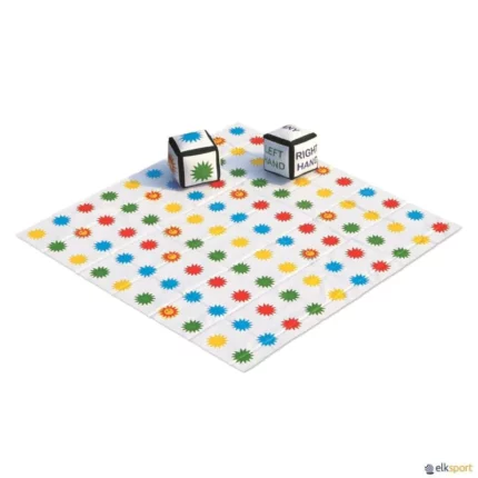 Jogo composto por um tapete e 2 dados infláveis. Ao lançar os dados é sorteada uma cor que indica em que sítio no tapete deve colocar a  parte do corpo sorteada no outro dado. Permite jogos de destreza e mobilidade ao respeitar as instruções coloridas dos dados (escritos em inglês). Dimensões do tapete: 3 x 3 m.