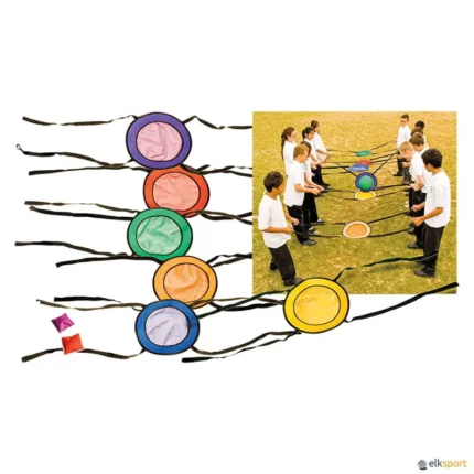 Este divertido jogo é ideal para ajudar a desenvolver competências de coordenação óculo-manual e outras destrezas, sendo também excelente para promover o trabalho em equipa. Os primeiros 2 participantes equilibram a bola ou outro objeto na base da sua banda e passam-no da sua banda de equilíbrio para a seguinte, e assim sucessivamente. O jogo é composto por: · 6 bandas de equilíbrio em 6 cores (amarelo, azul, laranja, vermelho, verde e violeta); cada banda é utilizada por 2 pessoas · 2 saquinhos macios Diâmetro da base da banda: 35 cm Recomendamos a utilização das bandas de cooperação e equilíbrio com: SAQUITOS ECONÓMICOS ALGODÃO  ou  BOLAS DE ESPUMA RESSALTO BAIXO.