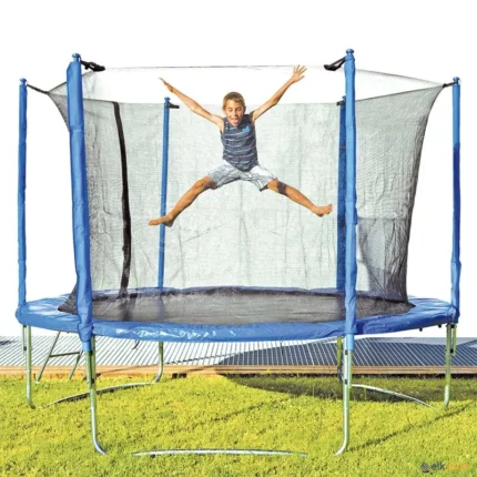 Fabricado em tubo de aço de 38 mm. Tela de salto elástica de polipropileno muito resistente. Tampas de PVC de 12 mm de espessura. Inclui rede de proteção com tratamento UV em volta da área de salto e espuma a recobrir as molas e postes. Idade recomendada a partir de 6 anos. Peso máximo do utilizador: 150 kg. Existe em 3 diâmetros: 1,9 - 3 e 4 m.