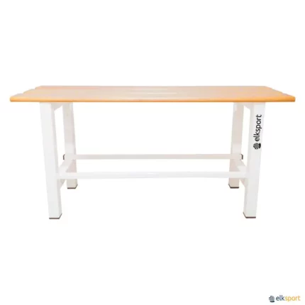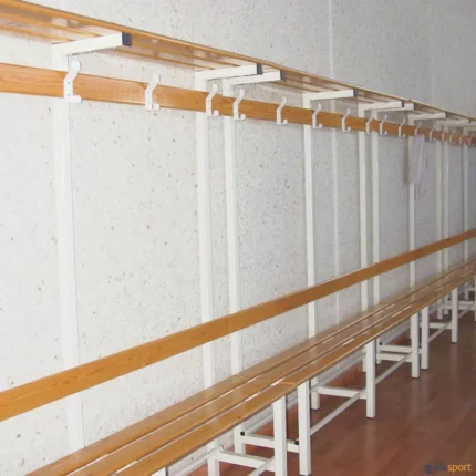 Banco fenólico com sapateira de 2 ripes e cabides. Material recomendado para balneários de piscina. Totalmente anti humidade, duradouro e robusto. Estrutura soldada em aço inoxidável tubo de 30 mm, pintado com epóxi. Taco em PVC. Variedade de cores disponíveis. Se não for especificado, será enviado na cor azul.