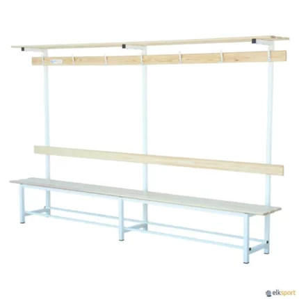 Banco de balneário duplo completo sobre estrutura metálica, com tábuas de pinho, encosto, plataforma superior e cabides em ambos os lados.
