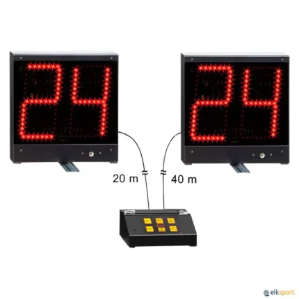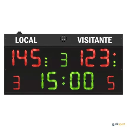 Aprovado pela FIBA nível 3. Tecnologia LED SMT de alta luminosidade dígitos com 20 cm altura, visibilidade a 90 m e ângulo de visão de 150°. A prova de choque da bola de acordo com as normas DIN 18032 e UNI 9554, não requer proteção frontal. Comunicação por rádio. Fácil instalação, inclui suportes para instalá-lo facilmente na parede. A consola de comando permite configurar vários modos de funcionamento de acordo com o desporto escolhido: tempo de jogo e intervalo, conta para a frente ou para trás, indicador de décimas de segundo do o último minuto de jogo, indicador da hora, ...
