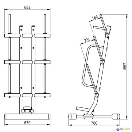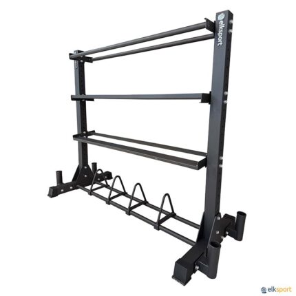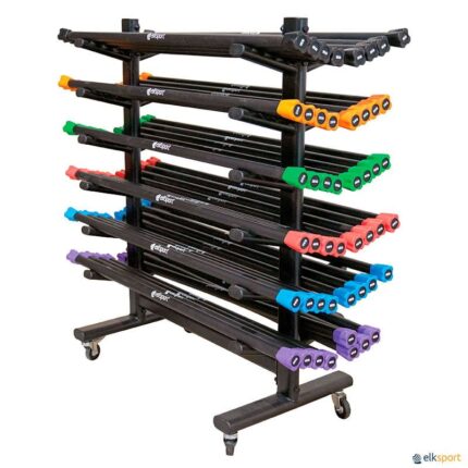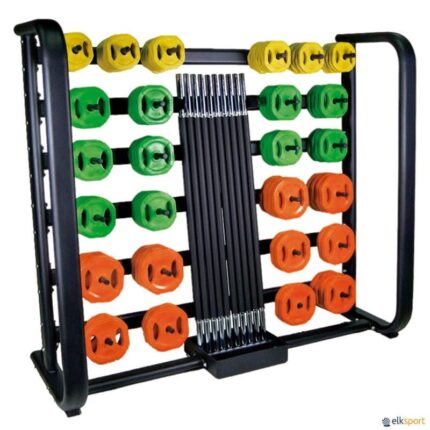 Móvel para armazenar conjuntos de barras e discos Body Pump, compatível com discos de 30 mm de diâmetro. Fabricado em aço de alta resistência com suportes revestidos a plástico para não danificar os pesos. · Comprimento: 68 cm · Largura: 76 cm · Altura: 156 cm · Capacidade: 12 conjuntos Body Pump (12 barras + 24 discos de 1,25 kg + 24 discos de 2,5 kg + 24 discos de 5 kg). Conjunto Body Pump não incluído.