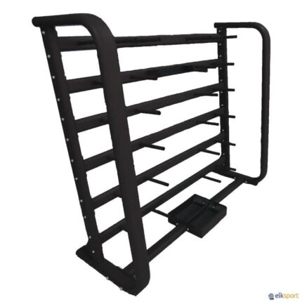 Móvel para armazenar conjuntos de barras e discos Body Pump, compatível com discos de 30 mm de diâmetro. Fabricado em aço de alta resistência com suportes revestidos a plástico para não danificar os pesos. · Comprimento: 183 cm · Profundidade: 69 cm · Altura: 160 cm · Capacidade: 20 conjuntos Body Pump (20 barras + 40 discos de 1,25 kg + 40 discos de 2,5 kg + 40 discos de 5 kg). Conjunto Body Pump não incluído.