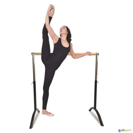 Barra de ballet portátil com barra dupla. Para realizar exercícios de barra, em grupo, nas aulas de ballet. Ajuda a trabalhar os músculos dos braços, peito, costas e centro usando o peso do próprio corpo. A altura é ajustável para todas as idades. Fabricado em aço com acabamento epóxi. Decoração da barra metálica imitação madeira. Pés antideslizantes. Entregue desmontada. Comprimento: 230 cm - 2 barras Diâmetro barra: 38 mm. Altura ajustável: mínima 70 cm/ máxima 113 cm. Peso barra: 10 kg. Carga máxima : 250 kg.