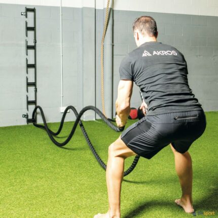Corda de treino funcional fabricada em material sintético entrançado, muito durável, resistente à humidade e à abrasão, com fita protetora nas extremidades para evitar que se desfaça e oferecer uma melhor preensão.