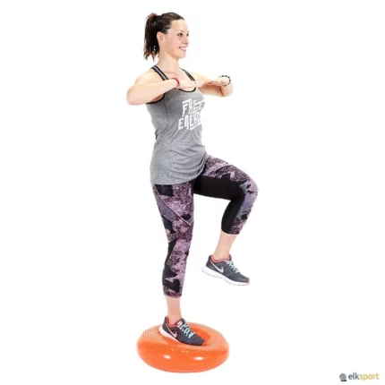 Grande disco insuflável com uma superfície rugosa para uma melhor aderência. De um lado tem uma superfície com pequenas saliências que proporcionam uma agradável sensação de massagem e do outro lado linhas circulares que proporcionam aderência ao solo durante o exercício. O Disco Sport da Gymnic destina-se a exercícios de motricidade, equilíbrio e também de recuperação funcional. A estabilidade do disco e grau de dificuldade variam de acordo com o enchimento do mesmo. Inclui caderno de exercícios.