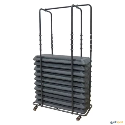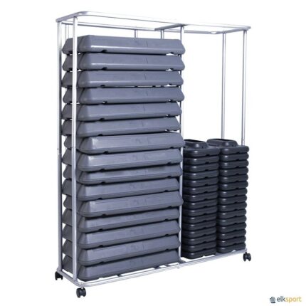 Móvel fabricado em aço para armazenar e transportar steps grandes. Adequado para as plataformas sem pés (não incluídas) do step profissional. Equipado com 4 rodas de 7,6 cm de diâmetro, 2 com travão e 2 sem travão. Características do móvel para plataformas do step profissional: · Capacidade: 18 plataformas. · Comprimento: 115,5 cm. · Largura: 47,5 cm. · Altura: 186,5 cm. · Peso: 21 kg.