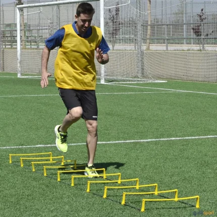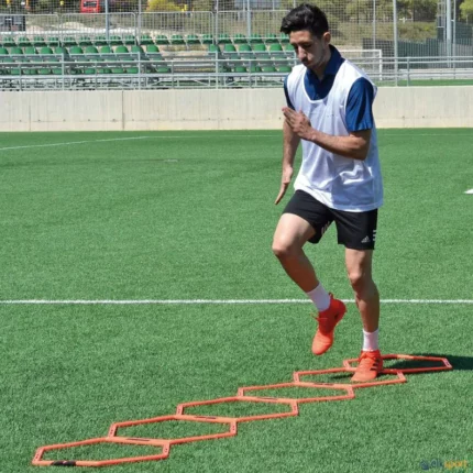 Escada de 6 arcos hexagonais que se podem utilizar individualmente ou em conjunto graças ao seu simples sistema de encaixe por clip. Os clips permitem uma grande variedade de situações, inclusive permitem que os arcos se possam elevar do solo, criando assim um circuito tridimensional. Este sistema, permite facilmente trabalhar velocidade, potencia, agilidade, e flexibilidade. Este é sem dúvida um acessório que oferece muitas possibilidades de treino. Incluí 6 clips de encaixe e um saco para transportar e armazenar.