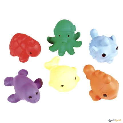 Flutuam e têm válvula de enchimento. Composto por 6 animais em 6 cores : peixe balão, peixe, baleia, foca, polvo e tartaruga.