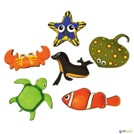 Lote de 6 animais lastrados que afundam e permanecem no fundo da piscina. Composto de: 1 Estrela do mar 12,5 x 12,5 cm. 1 Raia 14 x 13,5 cm. 1 Caranguejo 14 x 8 cm. 1 Foca 13 x 10 cm. 1 Tartaruga 15 x 13,5 cm. 1 Peixe 19 x 7,5 cm.
