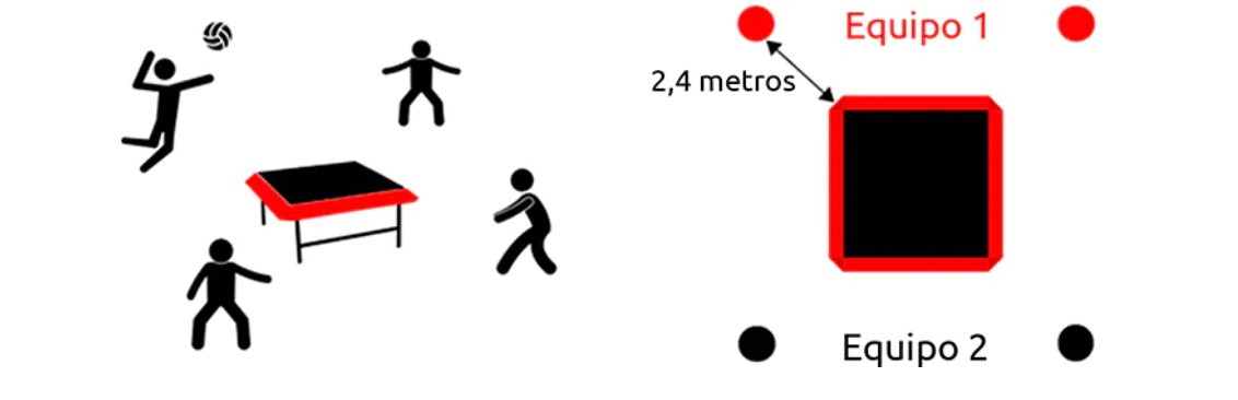 · O campo de jogo para competições deve ser delimitado por linhas demarcadoras em cada lado, formando um quadrado de jogo de 12 x 12 metros. Pode sair das linhas durante o jogo, mas a bola deve cair dentro ou sobre as linhas para ser considerada um ponto válido.