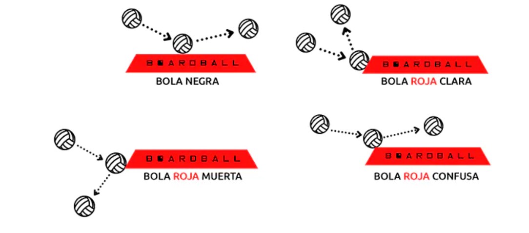 Bola Vermelha: Se a bola tocar na borda vermelha inclinada do tabuleiro em qualquer momento da jogada, é considerada uma “bola vermelha”. Isto implica que o número de toques é reiniciado para a última equipa que tocou na bola, e esta equipa tem até três toques adicionais para devolvê-la com sucesso. A posse não muda quando ocorre uma bola vermelha, a menos que se trate de uma “bola vermelha incerta” (ver mais adiante). Não há limite para a quantidade de bolas vermelhas que podem ocorrer durante uma jogada. É importante destacar que, para ser considerada uma bola vermelha, a trajetória da bola deve ser claramente redirecionada após atingir a borda vermelha inclinada. Existem três cenários gerais para uma «bola vermelha»: