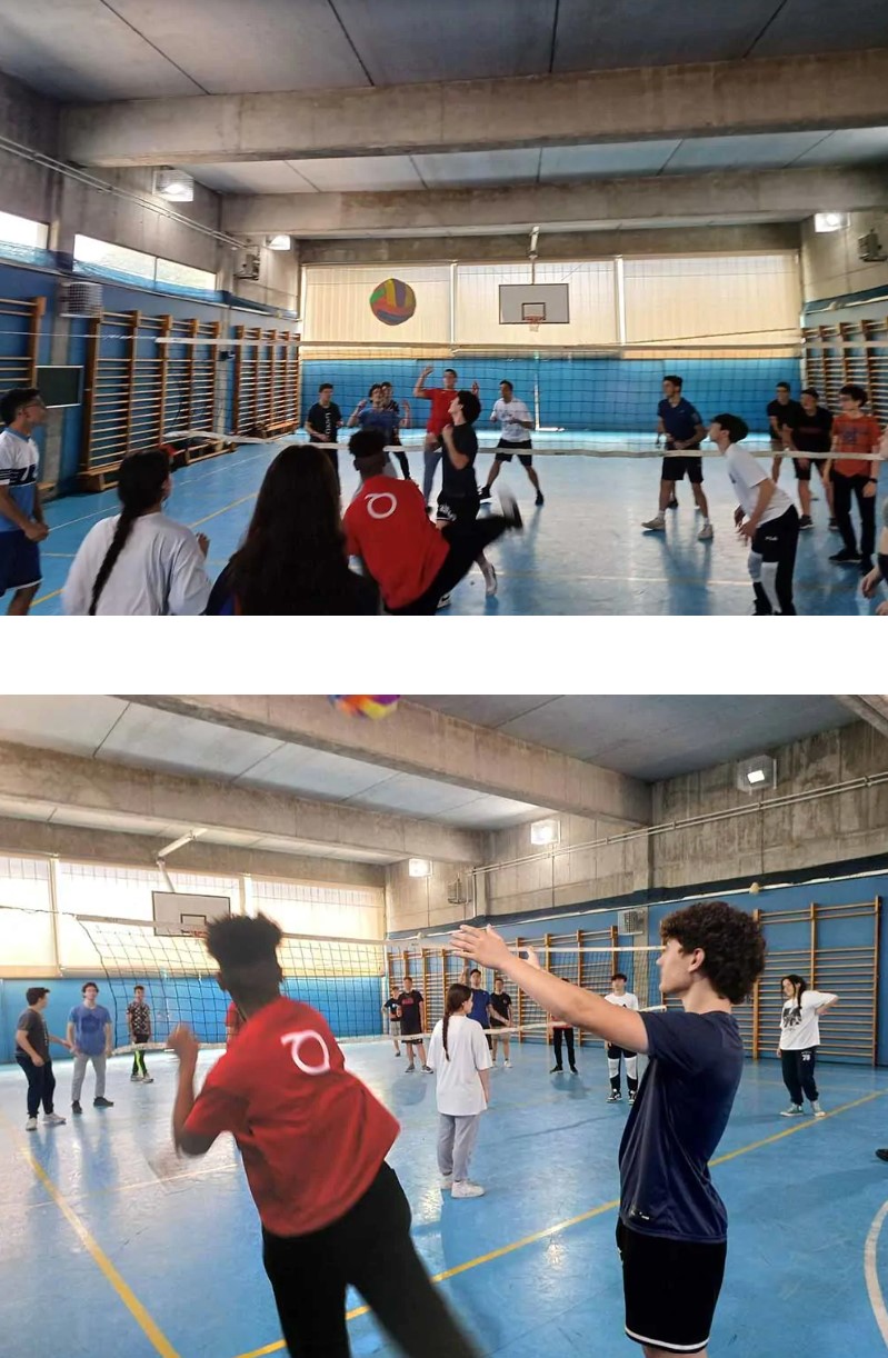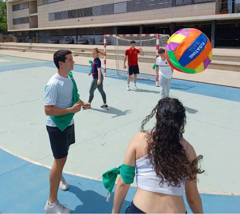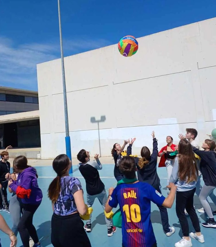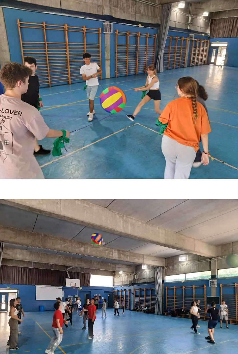 Jogo de três equipas de cerca de 6-8 pessoas, em que cada equipa deve evitar que a bola caia no chão. Em seguida, devem lançá-la de forma colaborativa ao ar (três alunos seguram-na, um bate-lhe), dizendo a cor da equipa que deve apanhá-la antes que caia no chão. Cada vez que uma equipa não consegue apanhá-la, as outras duas equipas somam um ponto.