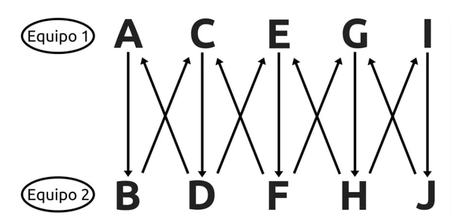 Com 4 ou mais jogadores, as regras permanecem as mesmas. No entanto, a bola deve ser passada entre os jogadores conforme indicado na ilustração.