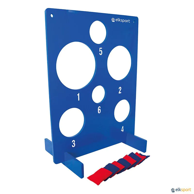Pode ser utilizado em qualquer lugar e monta-se de forma rápida e simples. Os orifícios do alvo estão marcados com pontuações de 1 a 6, de acordo com o grau de dificuldade, oferecendo um verdadeiro desafio na hora de escolher onde lançar o saquinho. Para ajustar o nível de dificuldade, o alvo pode ser colocado na vertical, inclinado no chão ou pendurado.