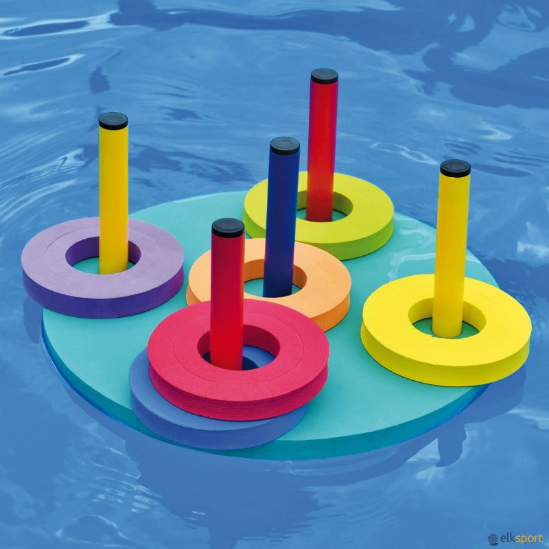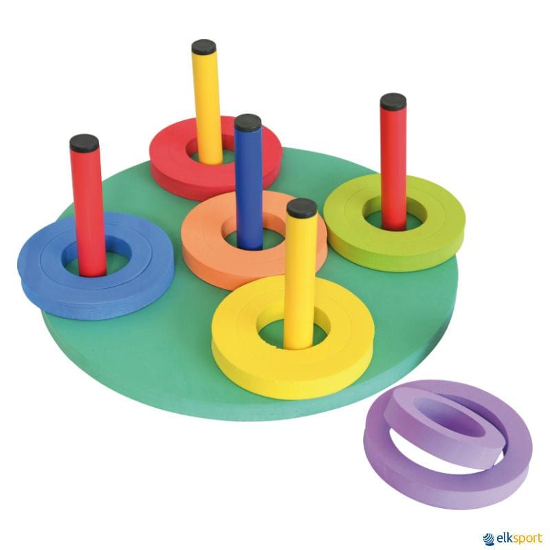 Um novo jogo de lançamento, perfeito para trabalhar a precisão no arremesso, com tripla dificuldade. As argolas de dois tamanhos podem ser unidas concentricamente para criar uma progressão na dificuldade do lançamento: argola grande, argolas unidas e argola pequena. O jogo flutua e pode ser utilizado em atividades em meio aquático.