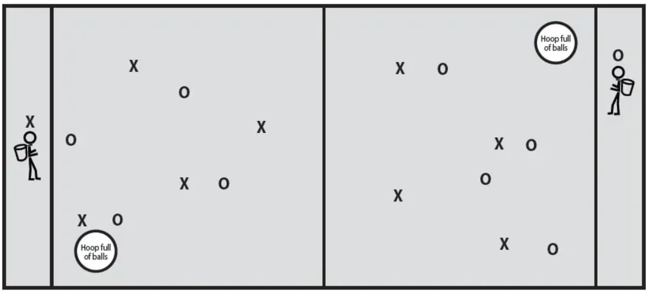 As bolas são colocadas num aro ou num quadrado dentro das linhas de fronteira. Os jogadores devem permanecer dentro da sua área. Os jogadores da equipa «X» tentam encestar as bolas no cesto móvel. A equipa que conseguir mais bolas no cesto dentro do tempo ganha.