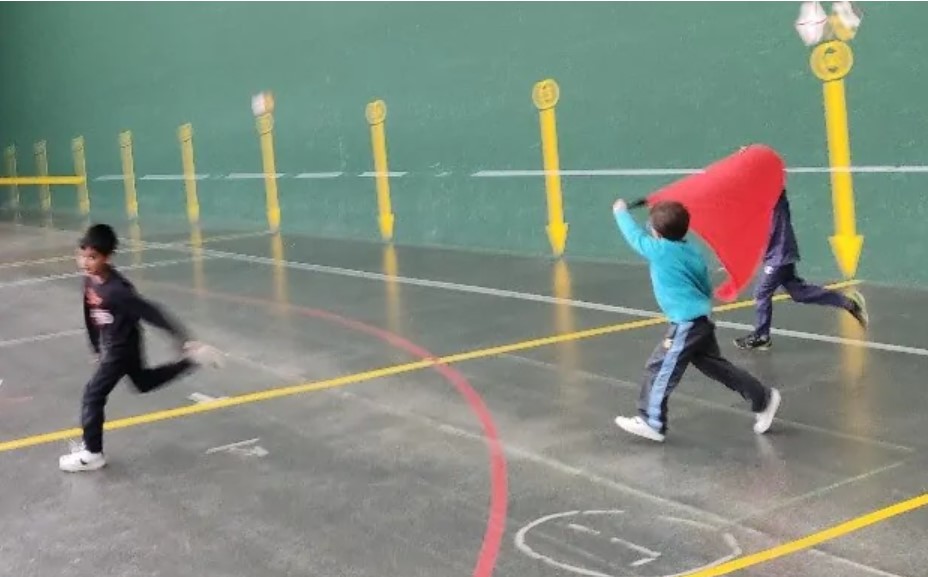 Indiaca-Loca. Jogo com pára-quedas coloridos de lançamento e precisão. Dividiremos a turma em grupos de 3 alunos, cada grupo tem três cones situados a diferentes distâncias e uma zona de lançamento. Um aluno lança e dois recebem. Existem três níveis de dificuldade, cada nível com pontuação diferente (1, 2, 3) e eles devem decidir onde se querem colocar em cada lançamento e quem será o aluno que lança. Através da técnica do marcador coletivo, devem superar a pontuação obtida pela turma entre todos os grupos e num intervalo de tempo de 5 minutos.
