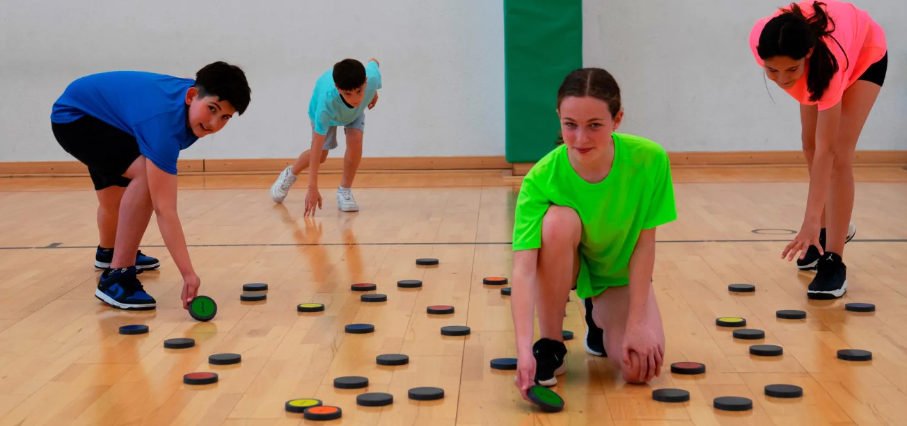 · Como se joga? As equipas colocam-se em fila atrás do ponto de partida da sua pista. Ao sinal, o primeiro jogador de cada equipa corre até ao final da sua pista e vira o disco da sua cor. Depois de virar o disco, regressa ao ponto de partida da sua equipa para que o jogador seguinte possa correr para o disco seguinte. A primeira equipa a virar todos os seus discos ganha.