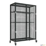 Fabricado em estrutura de aço estirado a frio, de 25 x 25x 1,5 mm e malha soldada de 50 x 50 mm e espessura de 5 mm, montado sobre 6 rodas de tipo industrial muito resistentes, 3 delas com travão. Tratamento contra a corrosão com pintura epoxi ao forno. Pode-se fechar por aloquete (não incluído). Possui 4 prateleiras metálicas reguláveis em altura. É entregue desmontado.
