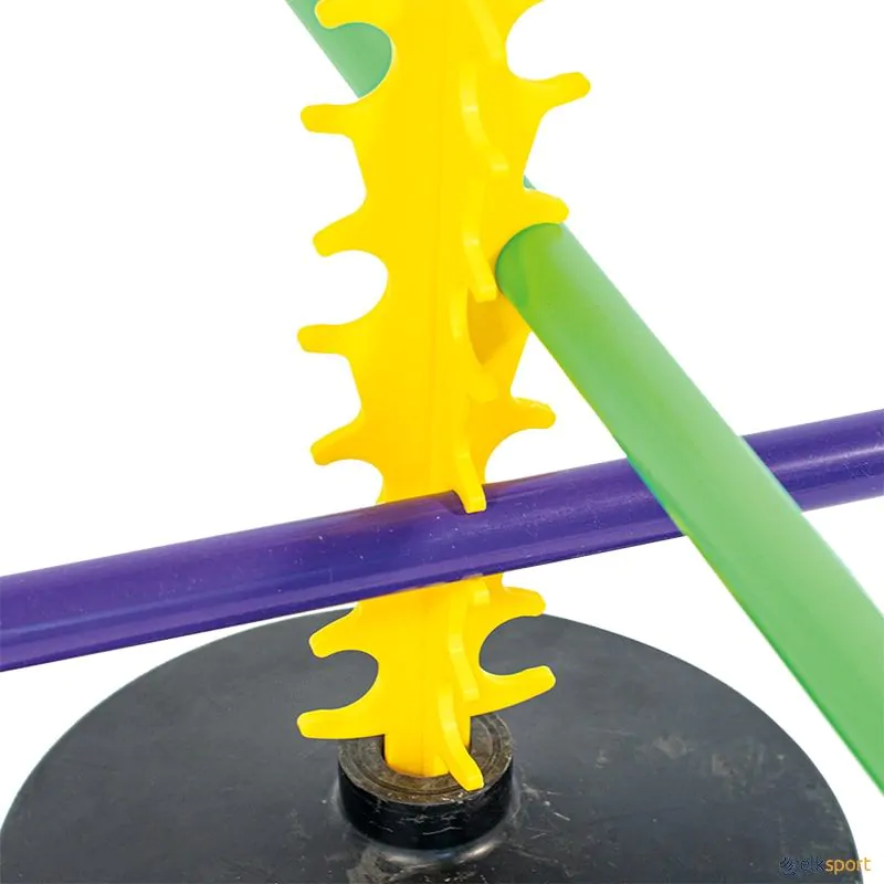 Suporte em PVC que, uma vez colocado na base lastrada permite posicionar até 16 bastões sobre 4 alturas diferentes e 4 direções.