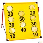 Alvo de lançamento transportável com numeração impressa por baixo de cada bolso. Parte frontal em poliéster com 8 bolsos de rede. Fácil de montar. Incluí 12 saquinhos em 4 cores.