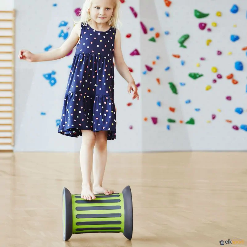Roller da conceituada marca Gonge: elemento cilíndrico concebido para trabalhar o equilíbrio de crianças e jovens. Pode utilizar-se como elemento de treino de equilíbrio ou como elemento sensorial pelas suas características tácteis. Ideal para estimular as capacidades propriocetivas, assim como todas as capacidades tácteis e no plano vestibular. É segura, não tem rodas, as partes mais salientes são revestidas a borracha para uma melhor aderência ao solo. Existe em duas cores. Para os mais jovens, aconselha-se a de cor verde por ser mais estável devido ao lastro de 2,5 kg de areia para reduzir a velocidade. Depois existe também a laranja mais rápida. Fabricado em polipropileno e borracha.