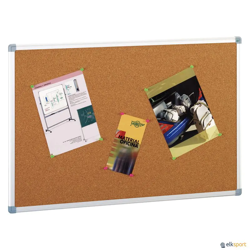 Quadro de alumínio com cantos decorativos. Superfície de afixação em cortiça sobre suporte de fibra de 10 mm. Permite a sua colocação em posição horizontal ou vertical. Fornecido com os acessórios de fixação.