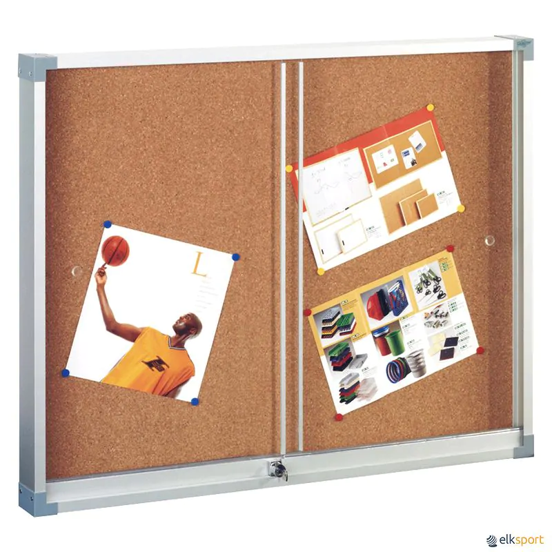 Quadro de alumínio com cantos decorativos, com 2 portas de correr sobre calha. Fechadura incluída. Vitrina recomendada para usar em escolas e locais de grande afluência de público, visto se tratar de material bastante seguro.