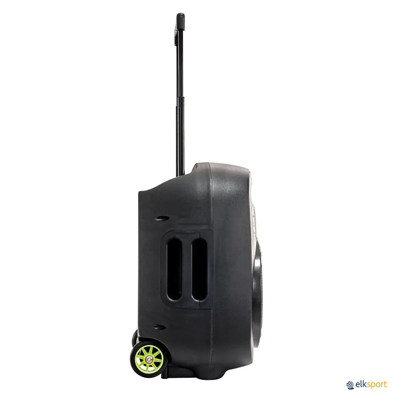 Sistema portátil de excecional qualidade sonora, equipado com uma bateria recarregável integrada. Fácil mobilidade graças ao seu carrinho retrátil e às rodas integradas de poliuretano com rolamentos de esferas. Inclui microfones sem fio VHF (de mão e de cabeça) e controle remoto.