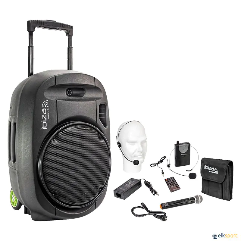 Sistema portátil de excecional qualidade sonora, equipado com uma bateria recarregável integrada. Fácil mobilidade graças ao seu carrinho retrátil e às rodas integradas de poliuretano com rolamentos de esferas. Inclui microfones sem fio VHF (de mão e de cabeça) e controle remoto. Indicado tanto para espaços interiores e exteriores. Entradas e saídas múltiplas para cobrir todas as necessidades e suportes digitais. NÃO UTILIZAR EM AMBIENTES HÚMIDOS.