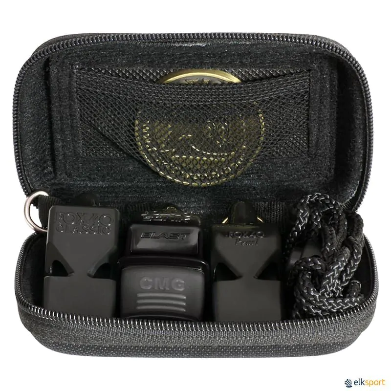O conjunto incluí:1 Apito Fox 40 Classic (115 dB), 1 Apito Fox 40 Sonik CMG (120 dB), 1 Apito Fox 40 Pearl (90 dB), 1 Cordão de nylon preto, 1 Moeda de latão fundido, 1 Estojo de nylon com fecho.