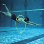 Outro jogo de mergulho ideal para exercícios de imersão em que as crianças vão ganhando confiança no meio aquático. Os arcos são lastrados para que fiquem submersos e os bastões, unidos aos arcos com as pinças, perfazem o efeito de túnel. O comprimento do túnel pode ser ajustado graças às pinças, mais ou menos afastadas.