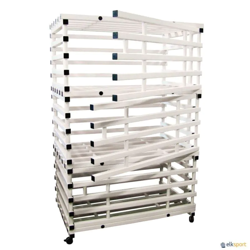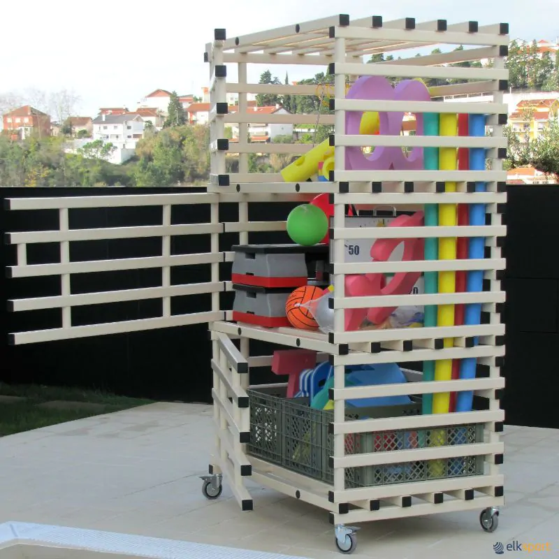 Estantes para armazenar de forma prática e adequada todo tipo de material de piscina. Fabricadas em tubos quadrados de resinas plásticas de alta qualidade, resistência 400 kg/m2, empilháveis e ampliáveis com novos elementos. Entregue desmontada e sem rodas