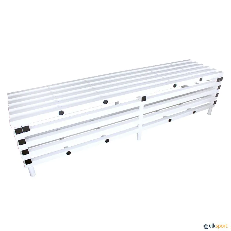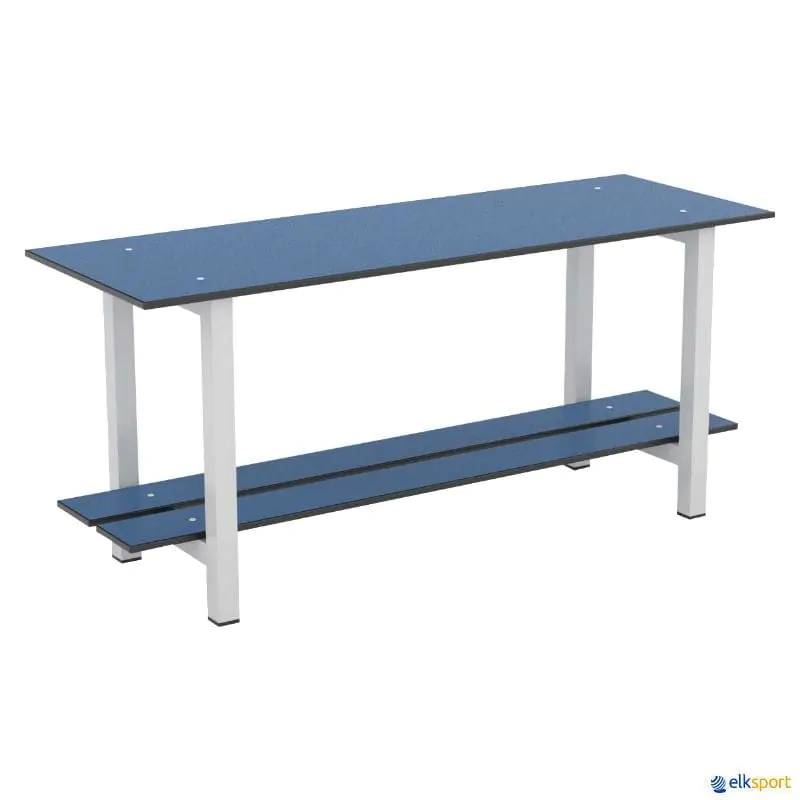 Banco fenólico com sapateira de 2 ripes. Material recomendado para balneários de piscina. Totalmente anti humidade, duradouro e robusto. Estrutura soldada em aço inoxidável tubo de 30 mm, pintado com epóxi. Altura de assento 45 cm - Largura 35 cm. Taco em PVC. Variedade de cores disponíveis. Se não for especificado, será enviado na cor azul.