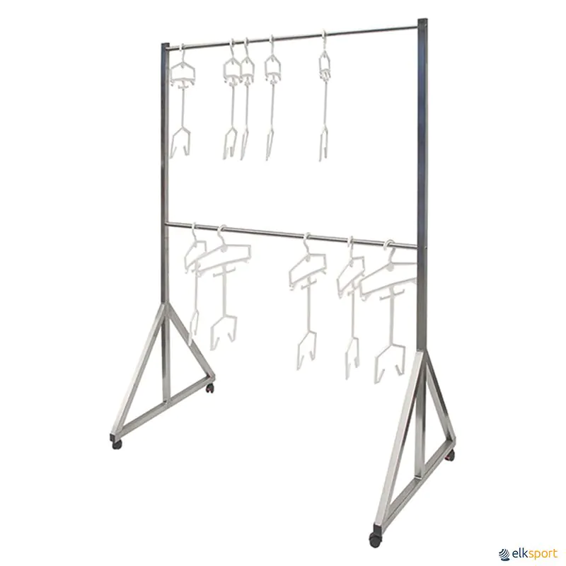 Suporte de cabides em aço inox AISI-304, com 2 barras, equipado de 4 rodas giratórias, 2 delas com travão.