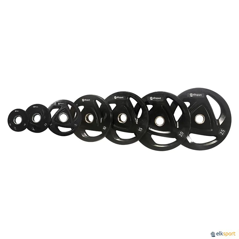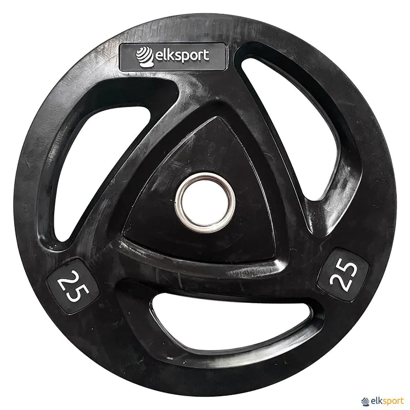 Disco olímpico de ferro revestido de borracha de alta qualidade. A partir de 5 kg vem com 3 pegas para facilitar o manuseio e aumentar suas
