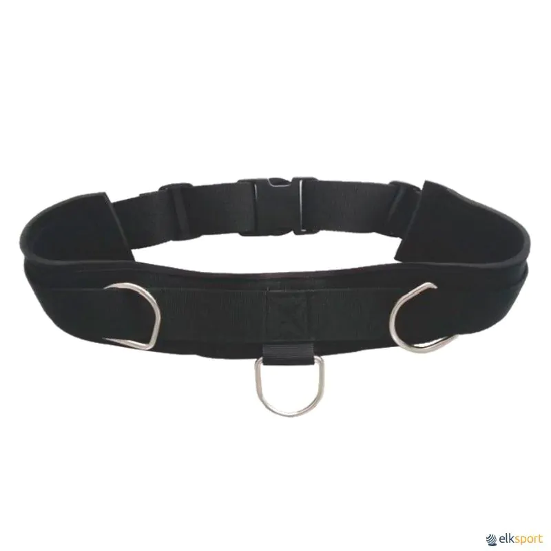 Cinto com 3 anilhas metálicas para fixar os elásticos de forma rápida e segura, nos treinos de força e resistência.