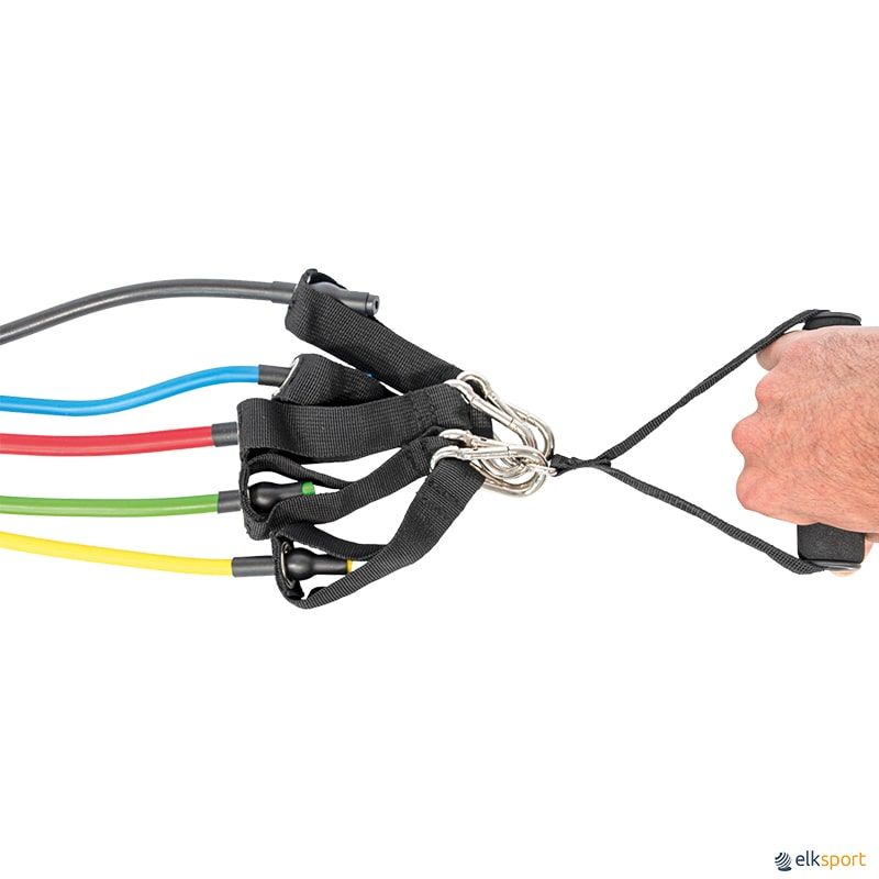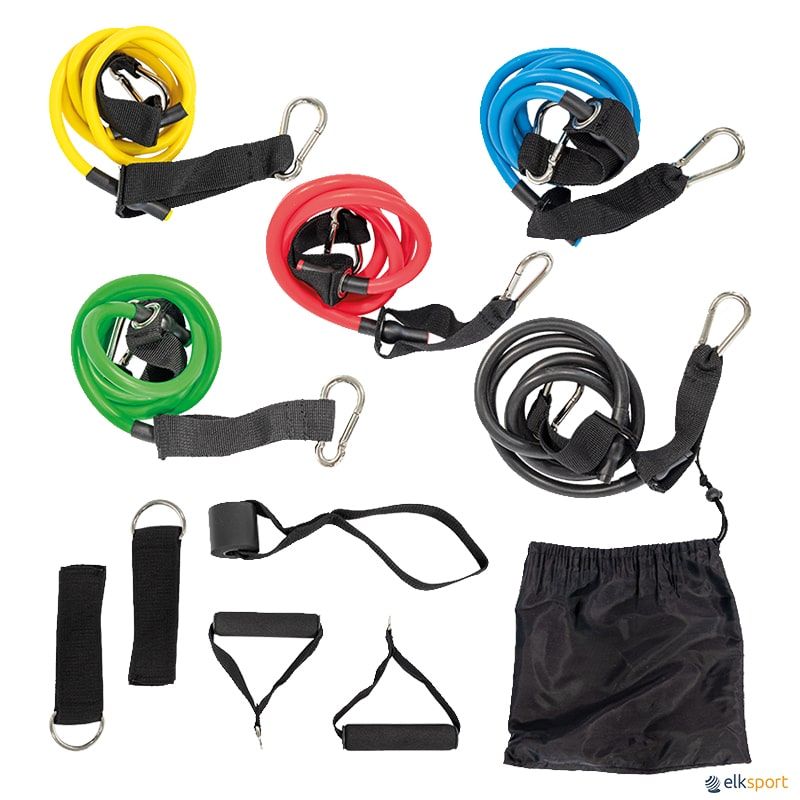 Kit composto por: 5 elásticos de 120 cm com mosquetão em 5 densidades (Ligeira, média, forte, super forte e Extra forte), 2 braceletes acolchoadas, 2 pegas para elásticos, 1 ancoragem de porta e bolsa de transporte. Pode-se regular a intensidade do exercício incrementando ou retirando elásticos nas pegas.
