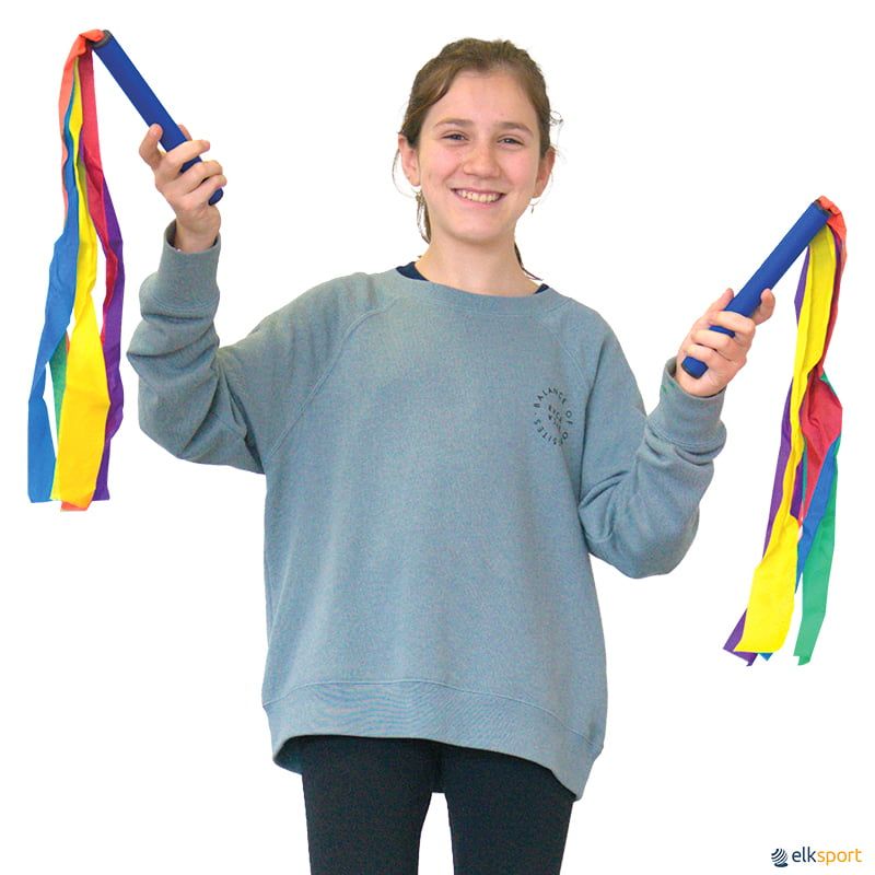 Estes bastões com fita acrescentam um toque de cor e diversão às aulas. Os alunos desenvolvem a coordenação e o ritmo numa idade precoce, enquanto aumentam a sua amplitude de movimentos, nas aulas de expressão artística e iniciação à ginástica rítmica. Cada bastão tem duas fitas de cetim da mesma cor mais brilhante do que a do bastão. Também podem ser utilizados para jogos por cores ou em equipa.
