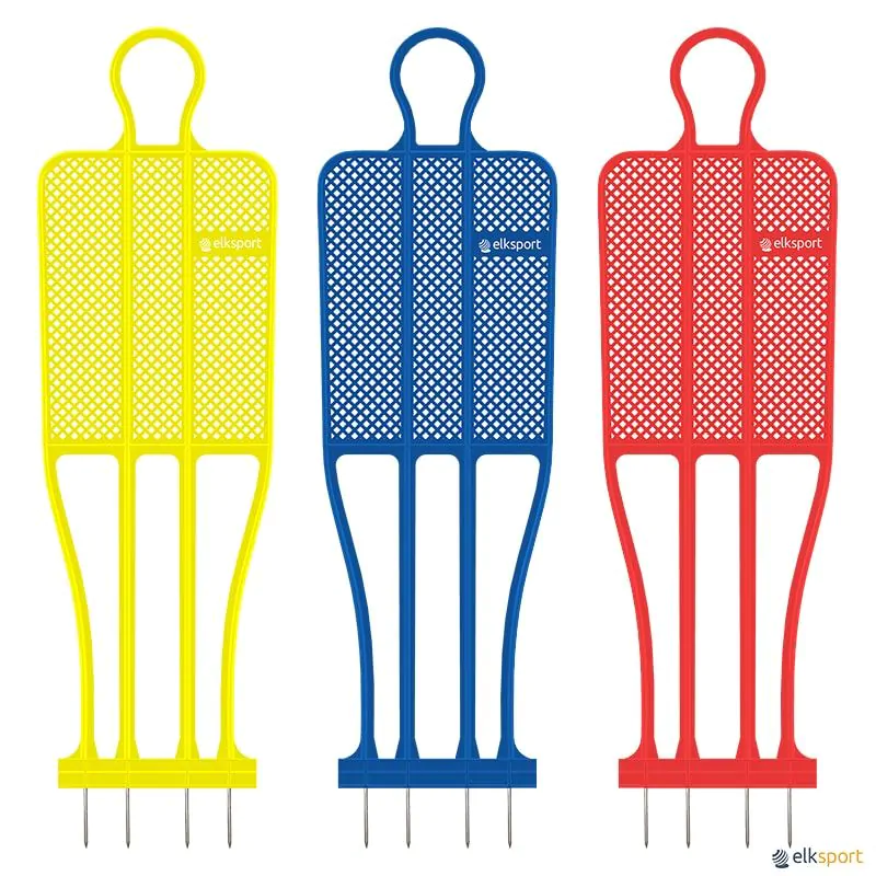 Manequim em plástico flexível, leve, muito resistente e seguro. Com 4 pontas de aço zincado para cravar na relva natural ou no carro barreiras D10467.