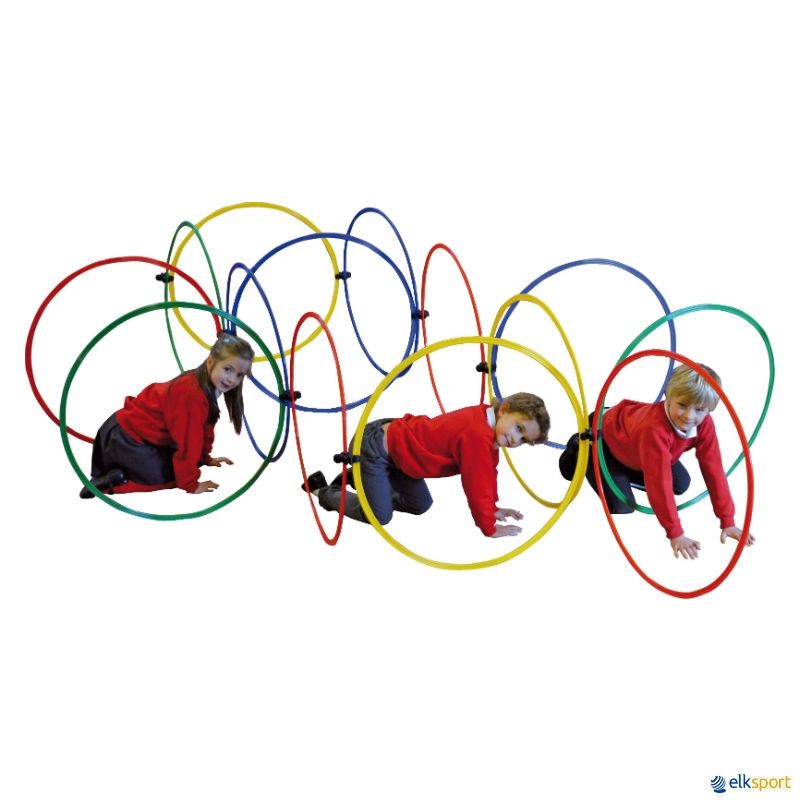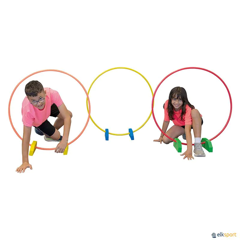 Este conjunto foi concebido para promover a agilidade, flexibilidade e o trabalho em equipa, através de atividades lúdicas com arcos e suportes coloridos. Os arcos podem ser distribuídos por toda a área de jogo, desafiando os participantes a moverem-se entre eles sem contato direto. Os exercícios podem ser realizados livremente ou transportando objetos. Em caso de toque num arco, a equipa deverá cumprir um exercício previamente definido antes de continuar. Vence a equipa que conseguir que todos os seus membros completem o circuito primeiro.