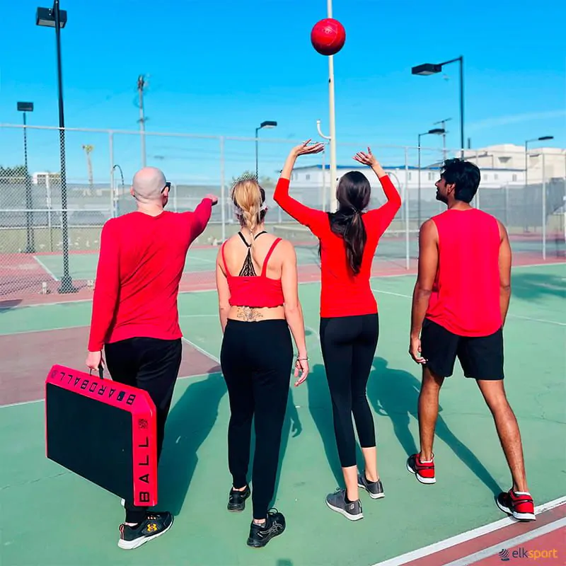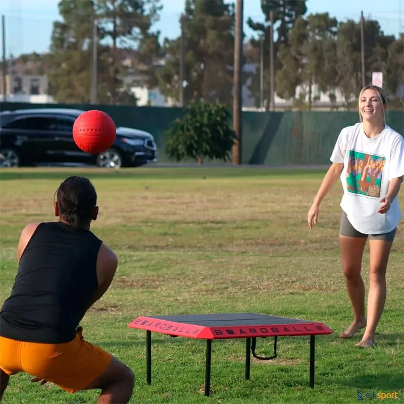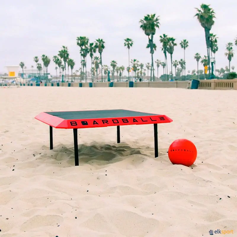 O Boardball é composto por: 1 tabuleiro portátil, 1 bola de voleibol e 1 bomba manual para encher a bola.