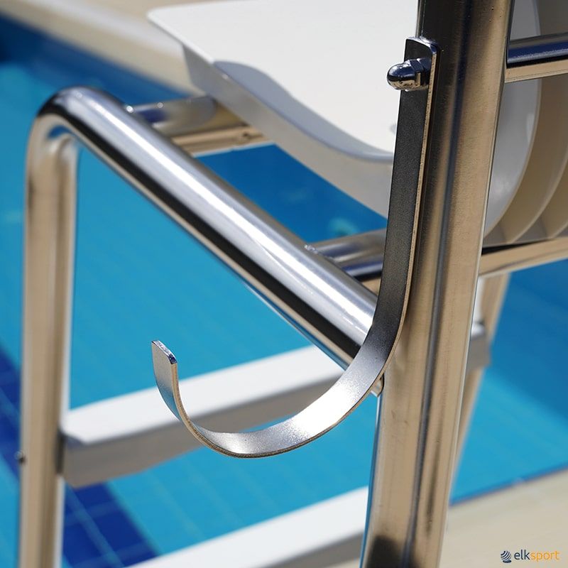Fabricada em tubo de aço inoxidável AISI 316 com 43 x 1,5 mm de espessura. Degraus e assento em plástico. Com rodas para transporte. Incluí suporte de aço inoxidável AISI 316 para boia salva-vidas circular. Boia salva-vidas não incluída.